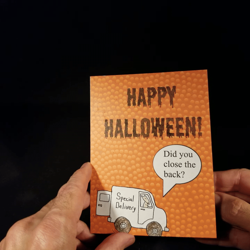 The entire card was cut by hard this time. The brown mechanism is Michael’s cardstock, and the ghosts are lighter index paper. I used pens to draw the ghosts and then cut them out. The background is pastels.