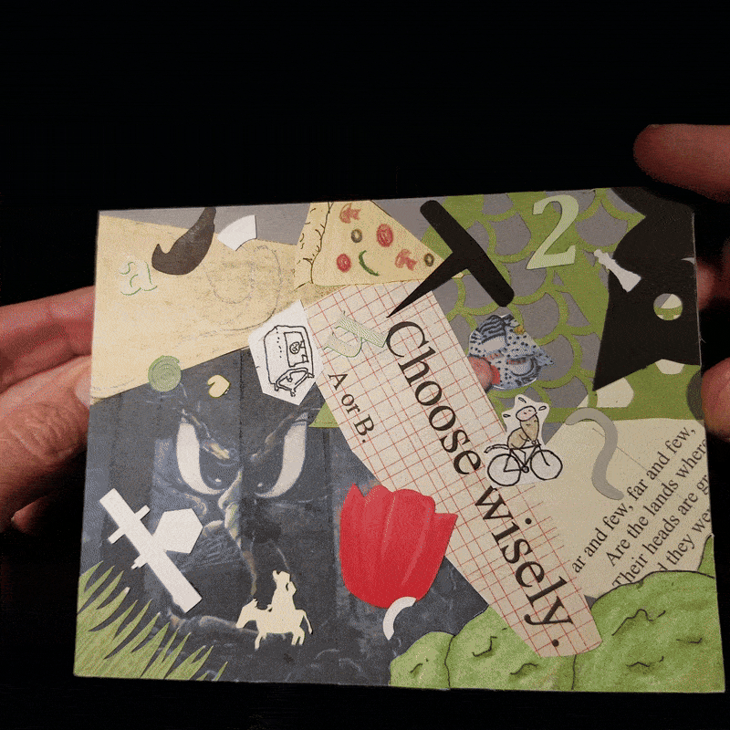There are four interactive mechanisms on the card. The first one is the big gear with a mouse moving inside the machine like Charlie Chaplin. It used a simple pivot as I’ve done on other cards (see March 2022). There is a piece of card on top of it to hide the mouse as he goes through the bottom of the machine.