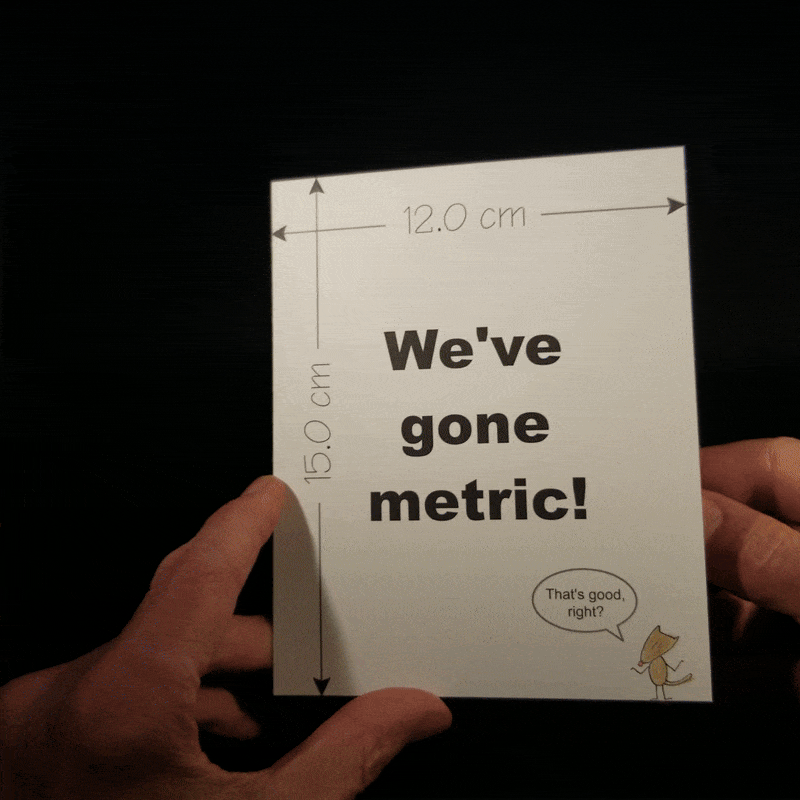My initial idea was to explain some of the metric system, showing the power of 10 as each unit increased (such as from mm, to cm, to meter). If I tried to show three units, there’s a 100 times difference in sizes. To do three squares or cubes within the card would make the smallest size tiny. After muddling around about that, I repeated myself by leaning on another set of mousy workers converting inches into metric units. You may notice these workers are in a cleaner environment, and wearing safety gear.